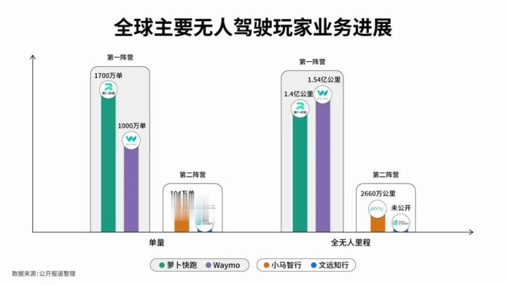 另一个重要的佐证是,Robotaxi行业的第二梯队与第一梯队差距明显。从公开数据来看,自2022年投入运营以来,小马智行Robotaxi累计收费单量仅为104万单,文远知行更是未公开其订单量,远远低于萝卜快跑和谷歌Waymo的单量。