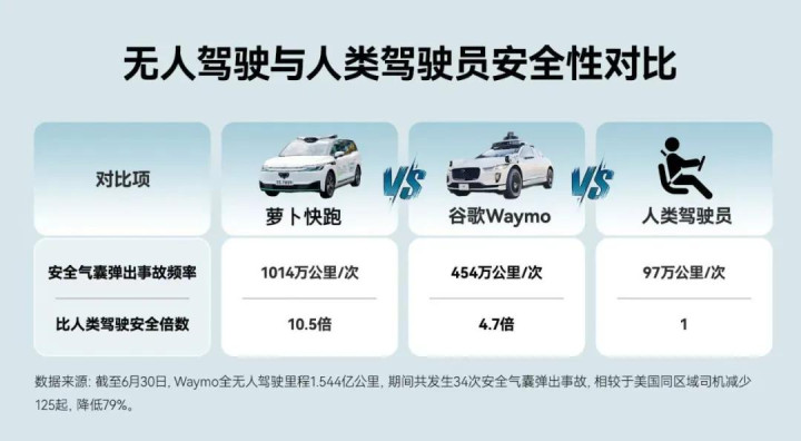 按此测算,人类驾驶员平均每行驶97万公里就会发生一次安全气囊弹出事故。这也意味着,在中国更复杂道路环境行驶下的萝卜快跑,比人类驾驶员安全十倍以上,达到10.5倍,远超谷歌Waymo,比谷歌Waymo还要安全2倍多。