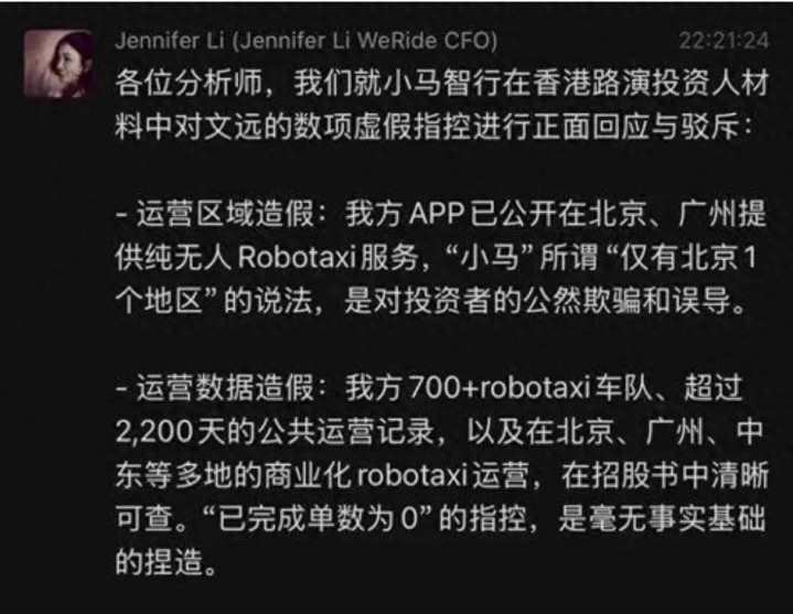 不过,双方却因“数据”打起了口水战。文远知行CFO李璇发布长文,直指小马智行在港股路演材料中对文远知行存在“运营区域造假”“运营数据造假”“技术实力存疑”等多项不实指控,并作出正面回应与驳斥。